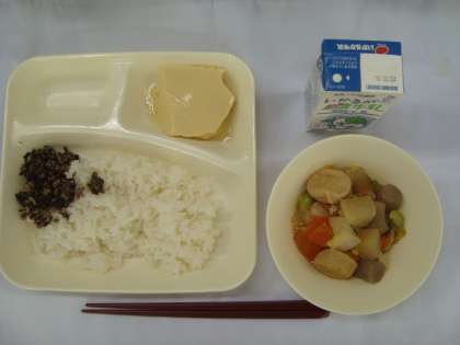 「卵どうふ 一口がんもと野菜の煮もの きゅうりの甘酢づけ ごはん 牛乳」