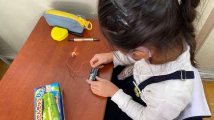 動線付きソケットと豆電球と乾電池だけを子どもたちに提供し、自分で試しながら、電気をつけてみました。「明かりがついたー」と大興奮していました。
