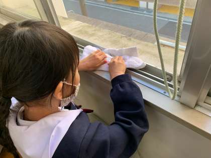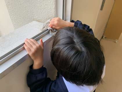 昨日に引き続き、今日も掃除の達人を見つけました!ぞうきんやほうきを上手に使って、窓やドアのサッシをピカピカになるまで掃除していました。細かな汚れに気付くことができるのは素晴らしいです!