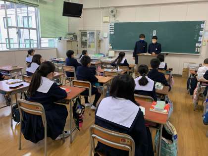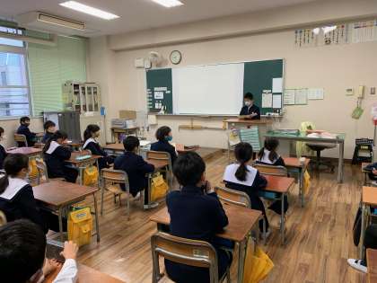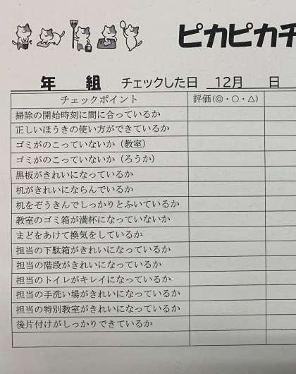 環境委員会が「ピカピカチェック」という活動をしています。各クラスの掃除がしっかりとできているかを環境委員会の児童がチェックして、良かった所やがんばってほしい所をそのクラスに伝えています。「ぞうきんで机がピカピカになるまでふけていました!」「掃除中に全ての窓を開けて、換気がしっかりとできていました!」等、良かった所を中心に報告してくれたので、児童は嬉しそうでした。