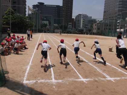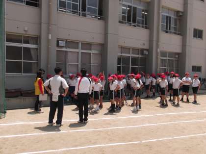 3時間目は、開平小学校の5年生を招いて、いっしょに50メートル走の記録を計測しました。互いに競い合って、充実した時間を過ごせました。