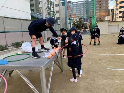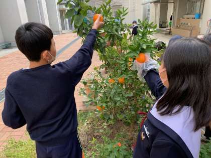 中庭にみかんが20個以上なっていました。環境委員会の児童がそのみかんを収穫して、今日の児童集会でゲームをしてプレゼントしてくれました。