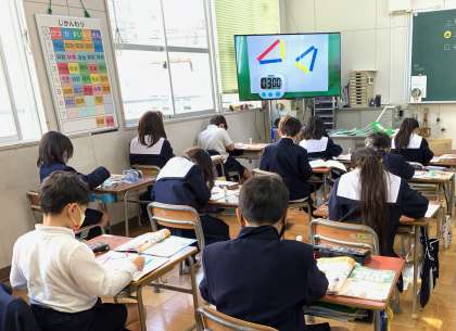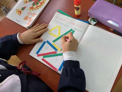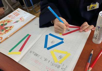 算数で「三角形と角」の学習をしています。今日は、長さの異なる4色のぼうをつかっていろんな三角形をつくりました。そして、それぞれの三角形の辺の長さに注目して仲間分けすることで、二等辺三角形と正三角形の特徴に気付くことができました。