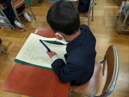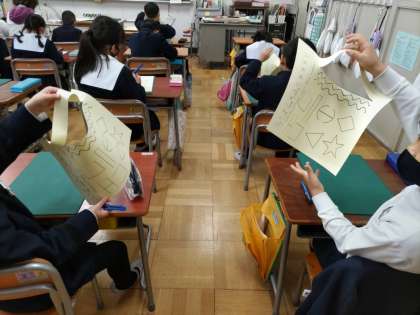 図工で「カッター名人になろう」の学習をしました。使い方の約束をしっかり守って、安全に切り抜くことができました。