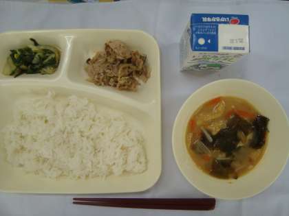 「豚肉のごまだれ焼き みそ汁 きくなとはくさいのおひたし ごはん 牛乳」