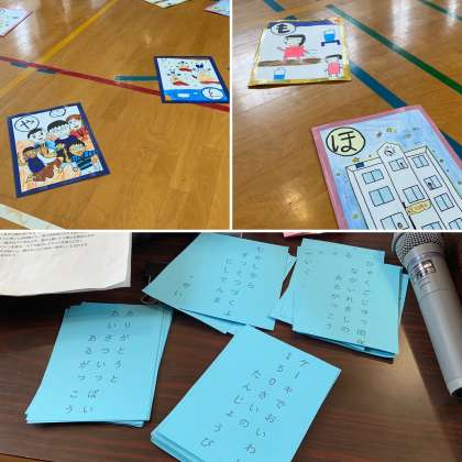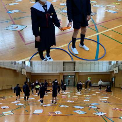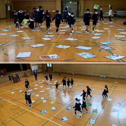 昼休みに、子ども達が楽しみにしていたジャンボかるた大会が、縦割り班ごとに行われています。縦割り班のお兄さん、お姉さんが、低学年の子たちと協力してかるたを取りにいく姿は、見ていて心が温まります。