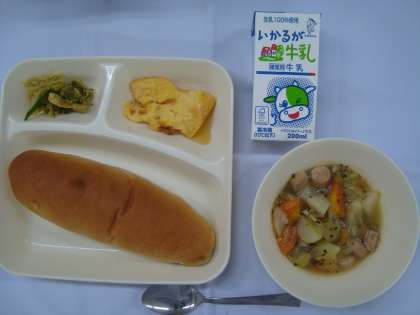 「ポトフ カレーソテー 焼きプリン パン 牛乳」