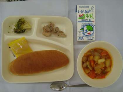 「鶏肉のバジル焼き ウインナーと野菜のケチャップ煮 ブロッコリーのサラダ パン 牛乳 アプリコットジャム」