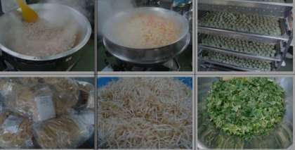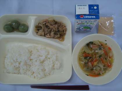 「豚肉と野菜のいためもの すまし汁 きな粉よもぎだんご ごはん 牛乳」