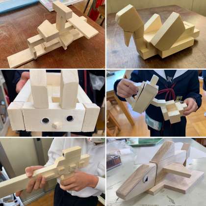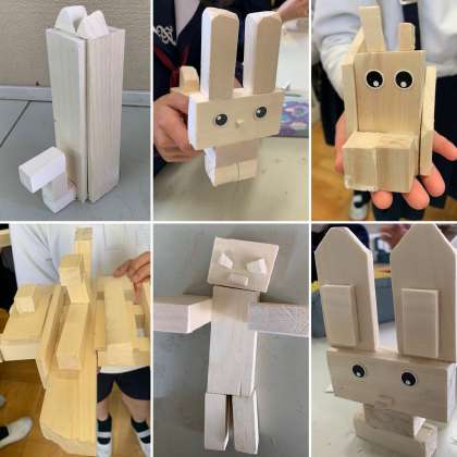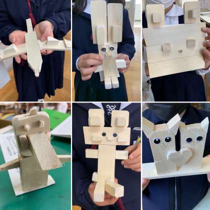 初めはただの角材だった木が、子どもたちの手で色々な形に変身しました!のこぎりややすりを上手に使って完成させました。