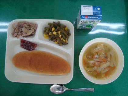 「豚肉のガーリック焼き スープ さんどまめとコーンのサラダ パン 牛乳 いちごジャム」
