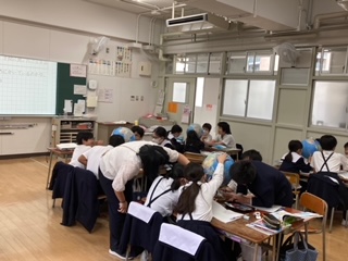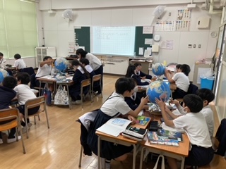 今日、社会科では地球儀を使った学習を行いました。地球儀に触れて疑問に思ったことを話し合い、国土の広がりや大陸の位置関係を学びました。