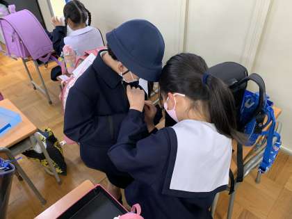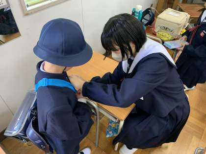 朝、登校してきた6年生がすぐに1年生の教室に行って、朝の用意のお手伝いをしていました。名札を自分でつけるのがまだ難しい1年生に、優しく名札をつけてあげたり、つけ方を教えてあげたりしていました。さすが最高学年です!