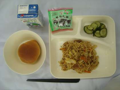 「焼きそば きゅうりのしょうがづけ ソフト黒豆 パン 牛乳」