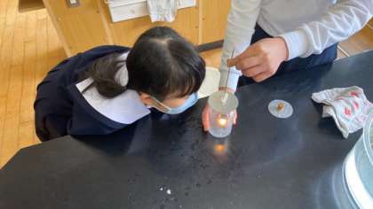 今日は、「ものの燃え方」について勉強しました。集気びんの中に窒素、酸素、二酸化炭素を集め、どの気体を集めたときにろうそくの火が燃えるか実験しました。