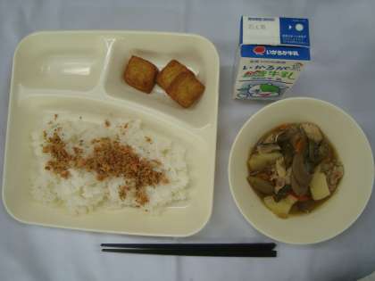 「鶏肉とじゃがいもの煮もの あつあげのしょうゆだれかけ 紅さけそぼろ ごはん 牛乳」