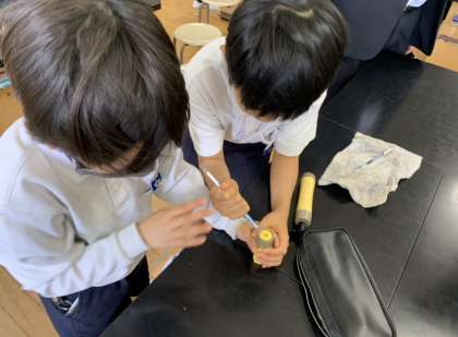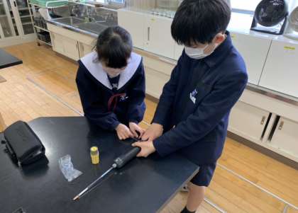 今日はものが燃えたあとの空気の変化を調べるために、気体検知管を使って実験をしました。初めて使う道具でしたが、先生の説明をよく聞き、