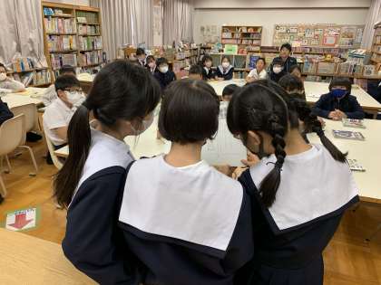 図書の時間に、図書係が紙芝居の読み聞かせをしていました。読むのがとても上手で、みんな紙芝居に夢中でした。いつか低学年の子にも聞いてもらいたいです。