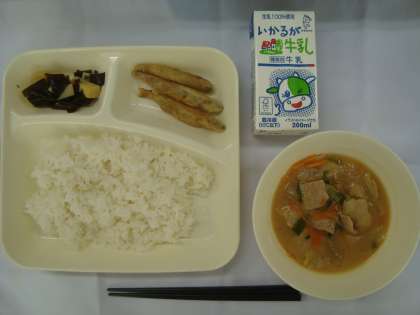 「きびなごのてんぷら 豚汁 わかたけ煮 ごはん 牛乳」