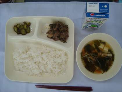 「プルコギ とうふとわかめのスープ きゅうりの甘酢づけ ごはん 牛乳」
