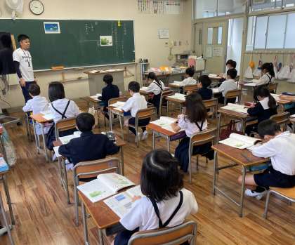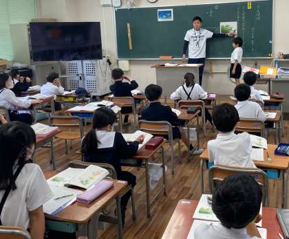 説明文教材を使った授業です。黒板のところに来て、挿絵を示しながら説明するなど、活発に意見を交流していました。