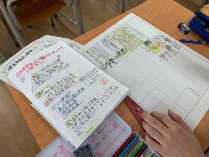 社会科「わたしたちの生活と政治」の単元で学んだ事を一人一枚の新聞にまとめています。年表や挿絵、Q&A等、読み手のことを考えた工夫がたくさんあり、新聞の完成が楽しみです。