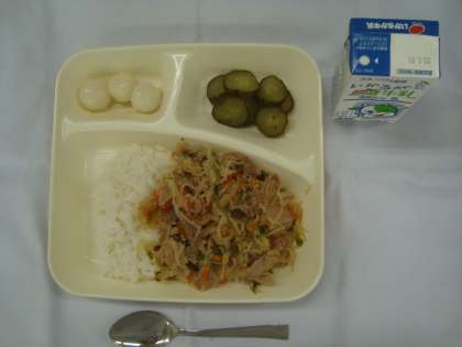 「豚丼 きゅうりの梅風味 白玉だんごのきな粉がけ 牛乳」