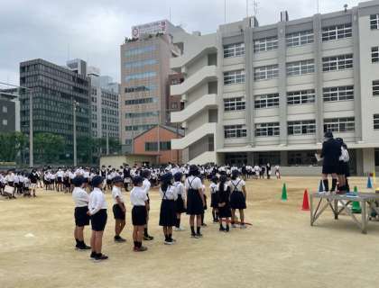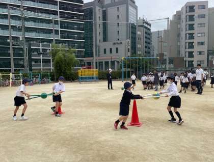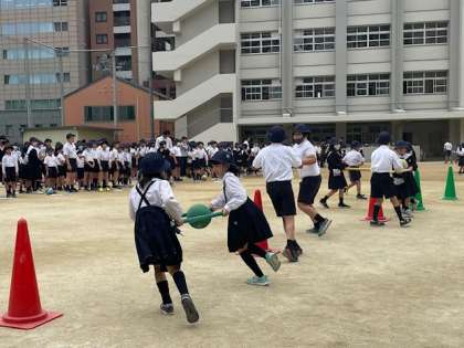 朝の児童集会の様子です。今回のゲームは「ボール運びリレー」です。高学年を中心に、それぞれの縦割り班のチームワークが高まってきました。