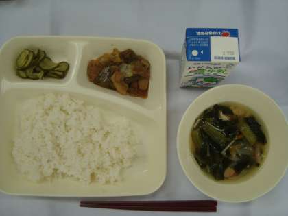 「ホイコウロー 中華スープ きゅうりのピリ辛あえ ごはん 牛乳」