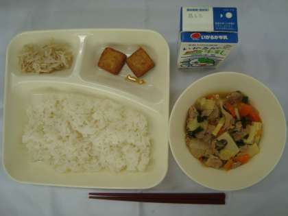 「中華煮 あつあげのピリ辛じょうゆかけ もやしの中華あえ ごはん 牛乳」