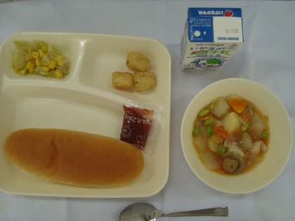 「いかてんぷら フレッシュトマトのスープ煮 キャベツとコーンのソテー コッぺパン いちごジャム 牛乳」