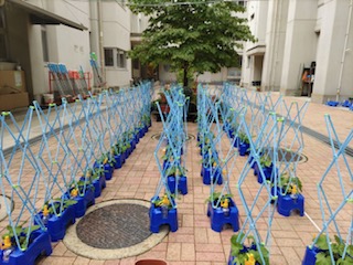 毎日水やりを続けているアサガオが、ぐんぐん成長しています。今日は肥料をまき、支柱を立てました。きれいな花が咲きますように。