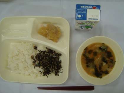 「鶏肉のおろしじょうゆかけ みそ汁 魚ひじきそぼろ ごはん 牛乳」