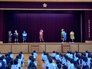 今日は、健康委員会の児童による劇「ヘルシーランドのピーターパン」の発表がありました。食事をした後はしっかりと歯みがきを行い、虫歯予防を心がけることが大切だと呼びかけてくれました。健康委員会のみなさん、どうもありがとう!