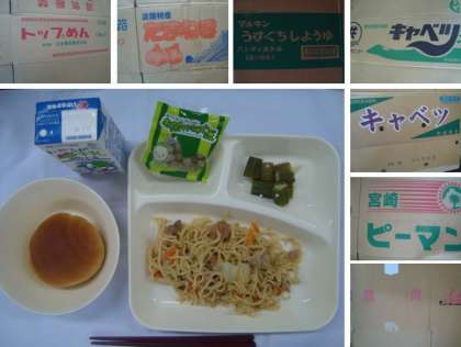 「和風焼きそば オクラの甘酢あえ まっ茶大豆 パン 牛乳」
