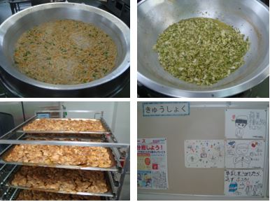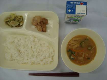 「鶏肉のしょうゆバター焼き みそ汁 野菜いため ごはん 牛乳」