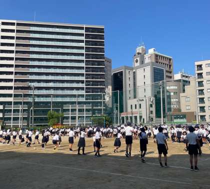 久しぶりにきれいな青空が広がる中、児童集会をおこないました。今回のゲームは「あわせて ポン!」です。ジャンケンのように同時にポーズをとり、リーダーと同じポーズなら交代していきます。
