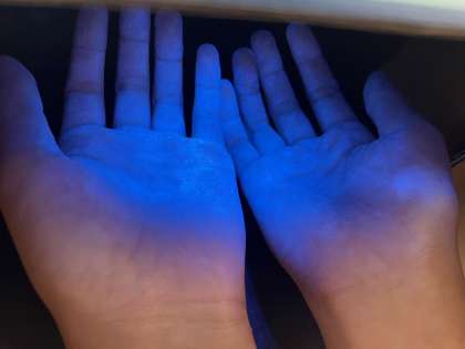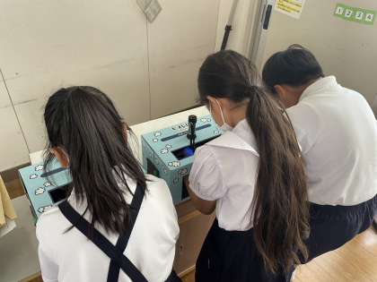 各学級ごとに手洗い指導の授業も行っています。ブラックライトで洗い残しが目でわかる教材も活用しました。