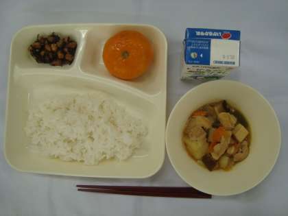 「鶏肉と野菜の煮もの ひじき豆 みかん(冷) ごはん 牛乳」