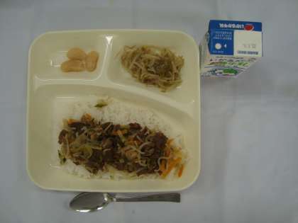 「牛丼 もやしとピーマンのごまいため 大福豆の煮もの 牛乳」