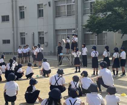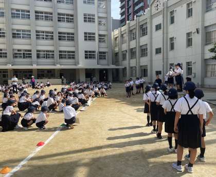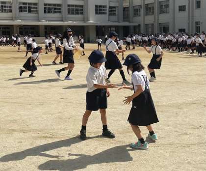 今回のゲームは「S字ジャンケン」です。各班が2つに分かれて、向かい合ってS字のコースを速歩きし、出会ったところでジャンケンします。勝った人はどんどん前に進み、負けた人は自分の列の後ろに並びなおします。みんなで楽しく盛りあがりました。
