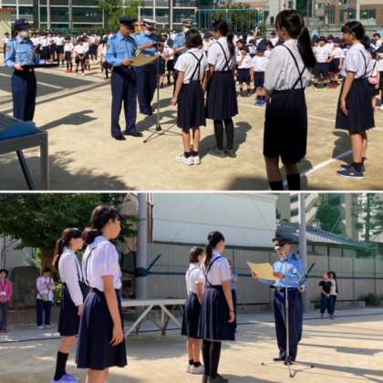 月曜日には、児童朝会で天満警察署長から表彰をしていただきました。また、金曜日には、天満警察署で表彰式が行われました。
