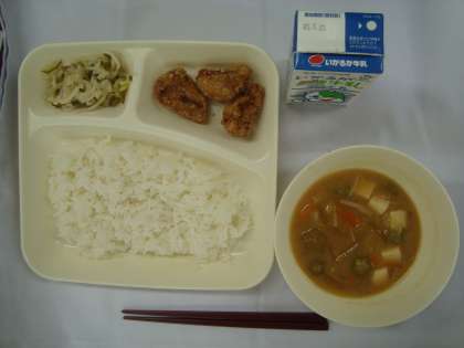 「豚肉のたつたあげ みそ汁 切干しだいこんのゆずの香あえ ごはん 牛乳」