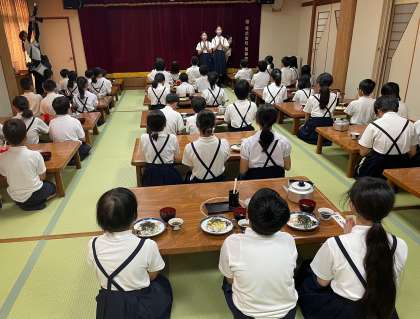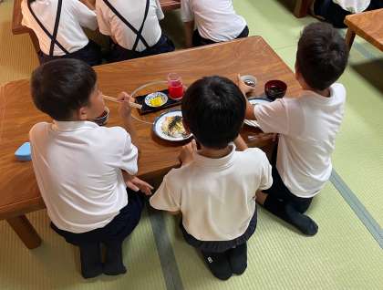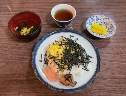 林間学習で初めての食事となる昼食です。メニューは、ちらし寿司、お吸い物、お漬物です。感謝の気持ちを込めて、いただきます!
