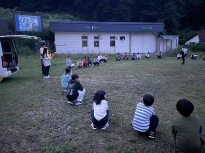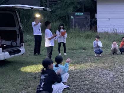 だんだんと夕闇が迫ってくる中、キャンプファイヤーが始まりました。ファイヤー係さんの練習の成果の見せどころです。