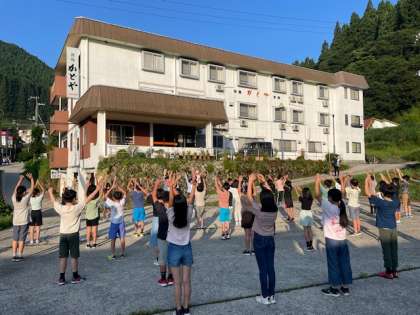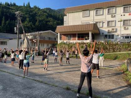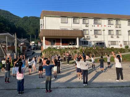 ラジオ体操です。指先までしっかりと伸ばして、大きな動きで体操をすることができました。