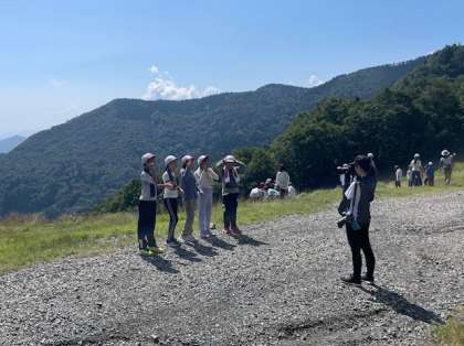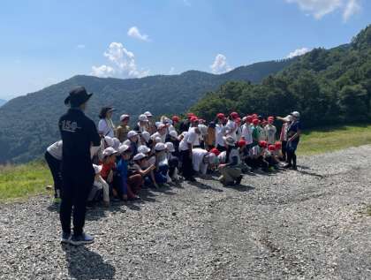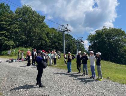 ついに、目的地の「ハチ北展望駅」に到着しました。素晴らしい景色をバックに、グループ写真や学年全体写真を撮りました。
