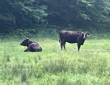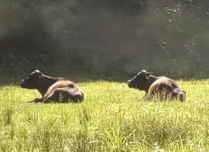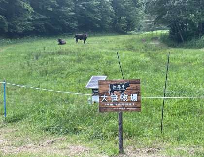 野外炊飯が終わり、次の活動場所への移動中に大笹牧場の前を通りがかった際、社会科で学習した肉牛の「但馬牛」と遭遇しました。別のタイミングで撮った写真では、偶然にも二頭が同じ形で可愛らしく座っていました。