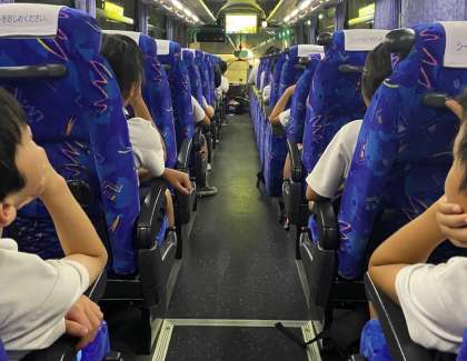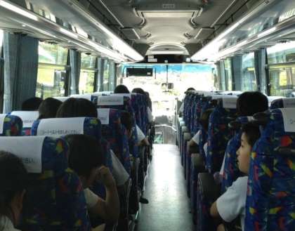 宿舎を後にし、大阪へ向かいます。バスの中では両クラスとも、ビデオを鑑賞するなど静かに過ごしています。
