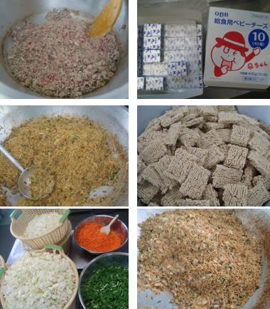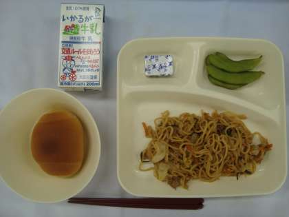 「オイスターソース焼きそば えだまめ 固形チーズ 黒糖ロールパン 牛乳」